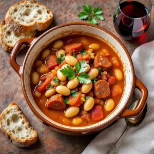 Remettez le chorizo, versez le bouillon, ajoutez les haricots. Portez à frémissement puis couvrez à demi et laissez mijoter 30–35 min à feu doux, jusqu’à sauce bien nappante.