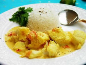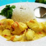 Ensuite ajouter le curry, tomate, crème fraîche, une pincée de sel et poivre et remuer avec la spatule. Déposer les morceaux de cabillaud au dessus.