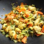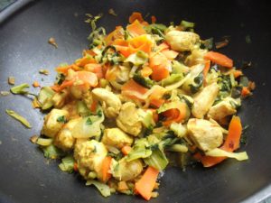 Une fois que le poulet est doré, rajouter le chou chinois taillé en lanières, les carottes coupées en bâtonnets très fin, l’oignon en rondelles et le gingembre râpé.